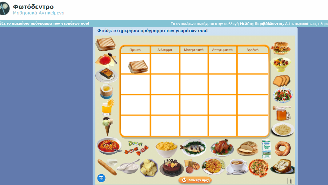 Τώρα που είστε πιο ενημερωμένοι για τις ομάδες τροφίμων, μπορείτε να μεταβείτε στο Φωτόδεντρο και προετοιμάσετε 2 μεσημεριανά μενού , 1 για μια καθημερινή και 1 για την Κυριακή. Σε κάθε μενού επιλέξτε 5 τρόφιμα. (τα σέρνετε και τα αφήνετε)