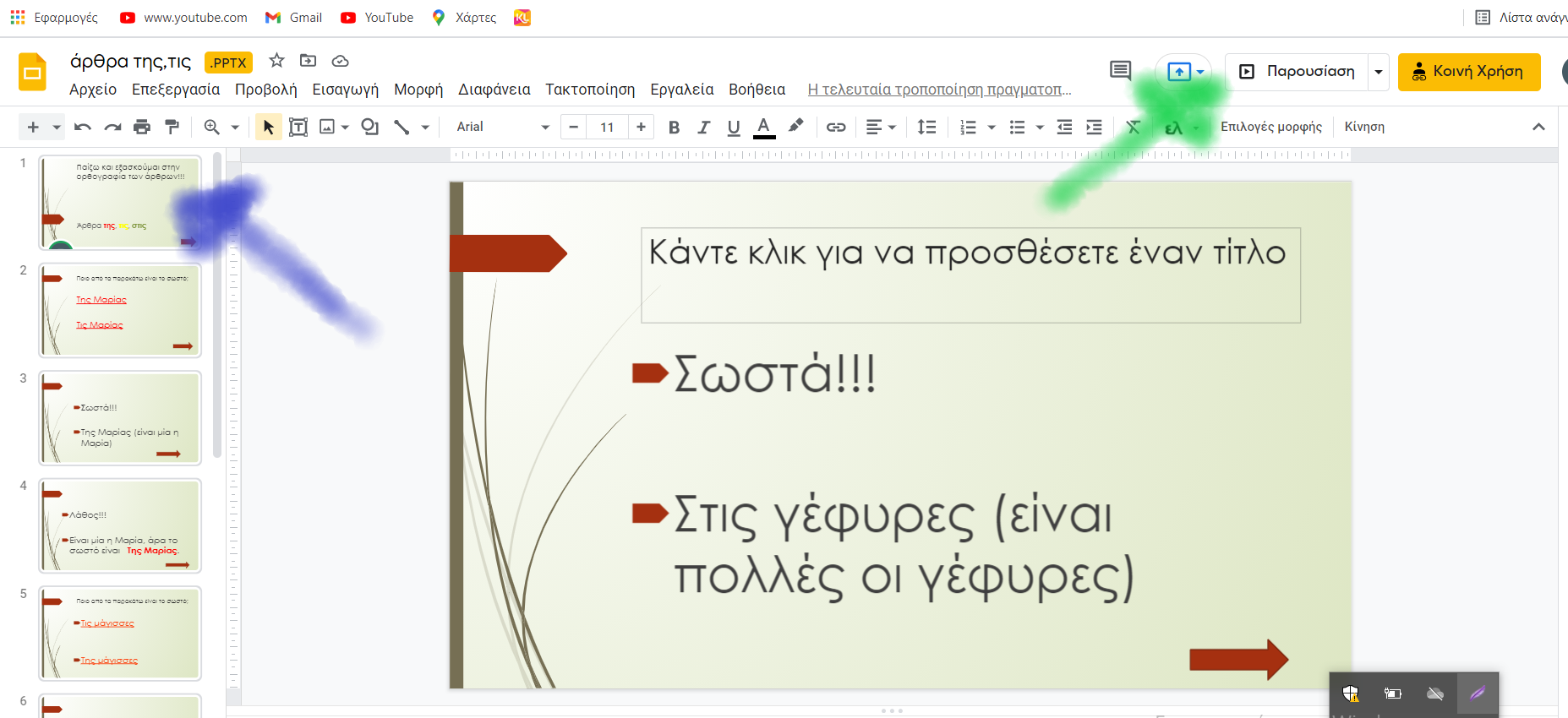 | Ενώνω κάθε λέξη με το σωστό άρθρο | Ποίημα άρθρο | επανάληψη στην ορθογραφία των άρθρων της - τις | Τα είδη των άρθρων και η κλίση τους | Επιλέγω το σωστό Για να παίξω το παιχνίδι, πατάω πάνω στη διαφάνεια 1 που βρίσκεται αριστερά (μπλε βελάκι) και μετά πάνω στο κουμπί Παρουσίαση που βρίσκεται πάνω δεξιά (πράσινο βελάκι).