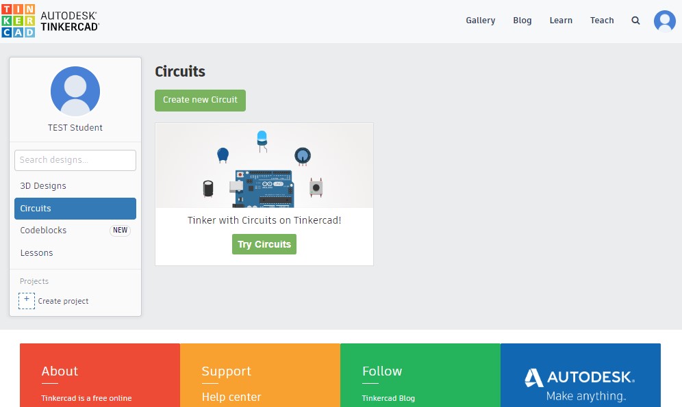 Στο επόμενο βήμα θα χρειαστεί να συμπληρώσετε το Nickname σας που είναι προσωπικό και πατήστε «That’s me!». ΠΡΟΣΟΧΗ!!! Τα Nickname θα σας τα δώσει ο καθηγητής και θα πρέπει να τα σημειώσετε γιατί θα σας χρειαστούν αργότερα. Στην καρτέλα Circuits μπορούμε να χρησιμοποιήσουμε το εικονικό εργαστήριο ηλεκτρονικών κυκλωμάτων του Tinkercad με τη δυνατότητα εξομοίωσης. Για να δημιουργήσετε ένα καινούριο κύκλωμα πατήστε το σύνδεσμο Create new Circuit. Εξερευνήστε στα αριστερά τη λίστα με τα εξαρτήματα που υπάρχουν διαθέσιμα. Μπορούμε να χρησιμοποιήσουμε πολλά εξαρτήματα στο χώρο σχεδίασης, είναι καλό αν μπορούμε να ακολουθούμε τη πρακτική του εργαστηρίου όπου για τα κυκλώματά μας χρησιμοποιούμε ένα Breadboard. Όλα τα εξαρτήματα συνδέονται μεταξύ τους με αγωγούς κάνοντας click στα άκρα τους. |